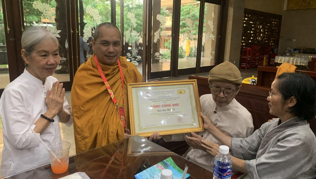 Nhân duyên với nhà thơ Trụ Vũ là một điều vô cùng ý nghĩa đối với tôi. Được tiếp cận bậc tiền bối từng có duyên làm việc cùng quý Trưởng lão trong tông môn Khất sĩ là một điều hy hữu và vinh hạnh. Đặc biệt, vào dịp “Đại lễ kỷ niệm 100 năm hiện thân vào đời, hoằng hóa độ sinh” của Tổ sư, tôi đã thay mặt Ban Thư ký Hệ phái Khất sĩ trao bằng Tuyên dương công đức của Hệ phái đến nhà thơ Trụ Vũ. Đây không chỉ là sự ghi nhận công lao, mà còn là sự tri ân sâu sắc đối với người đã góp phần gìn giữ và lan tỏa đạo nghiệp của Tổ sư qua những vần thơ thấm đượm tinh thần Khất sĩ và đầy xúc cảm.