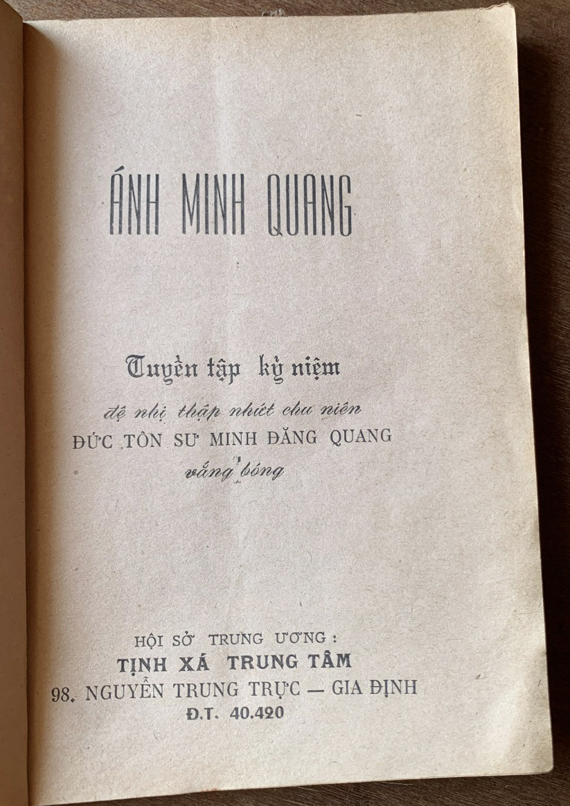 Trong những ngày cuối năm Giáp Thìn, với sự hỷ lạc và ấm áp của chuyến trở về Tổ đình tịnh xá Ngọc Phúc Gia Lai để đảnh lễ Sư phụ Hòa thượng Bổn sư, tôi cũng có dịp ghé thăm một số tịnh xá huynh đệ. Một nhân duyên hy hữu đã đến khi tại tịnh xá Ngọc Như, trong lúc các chú đang dọn dẹp, sắp xếp lại những đóng sách cũ để chuẩn bị đón Tết, tôi tình cờ nhặt được ấn phẩm nội san “Ánh Minh Quang”, bản in năm 1974, được phát hành nhân “đệ nhị thập nhất chu niên Đức Tôn sư vắng bóng”. Theo lẽ, khoảng thời gian từ 1954 đến 1974 vừa tròn 20 năm, nhưng trên ấn phẩm lại ghi là 21 năm. Có lẽ đây là một sự nhầm lẫn, hoặc cũng có thể là cách tính năm theo lối quen thuộc của người miền Nam.