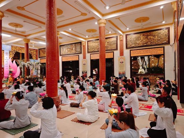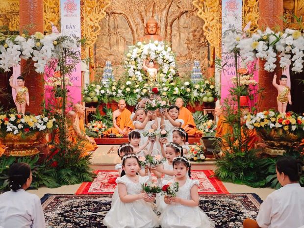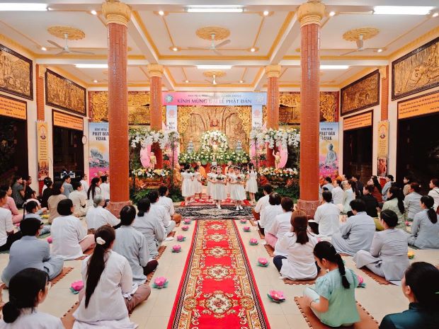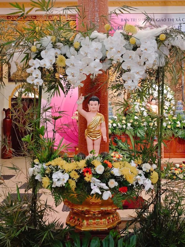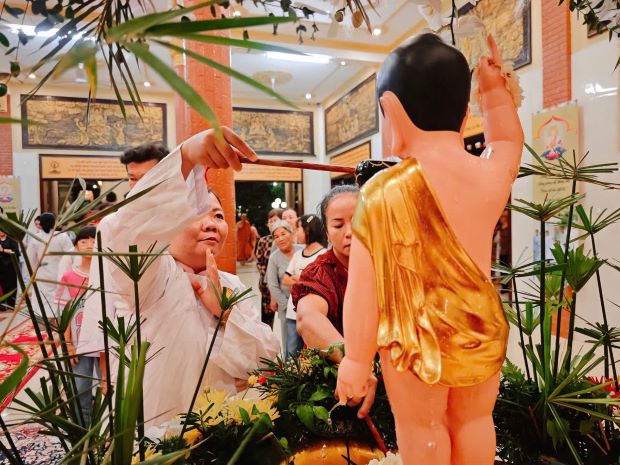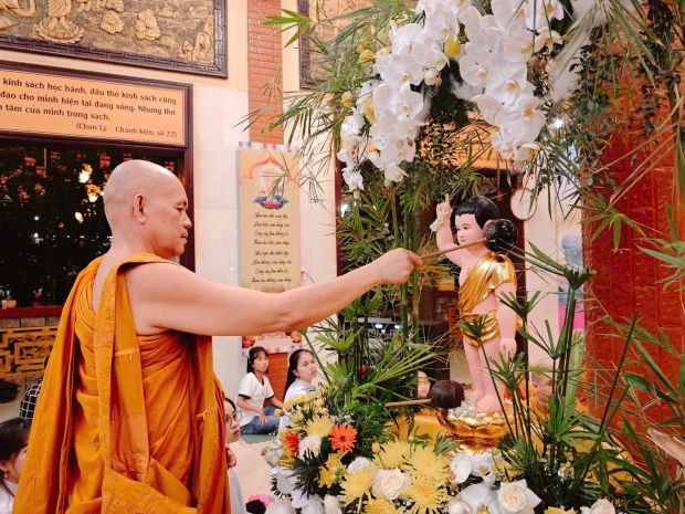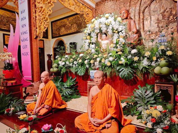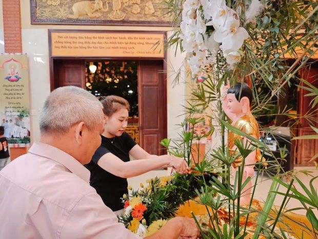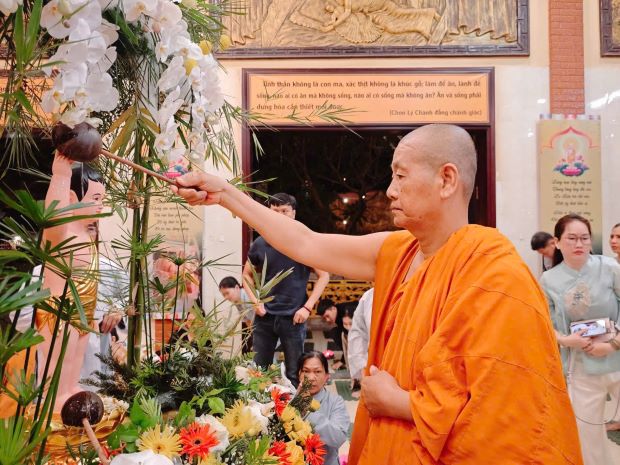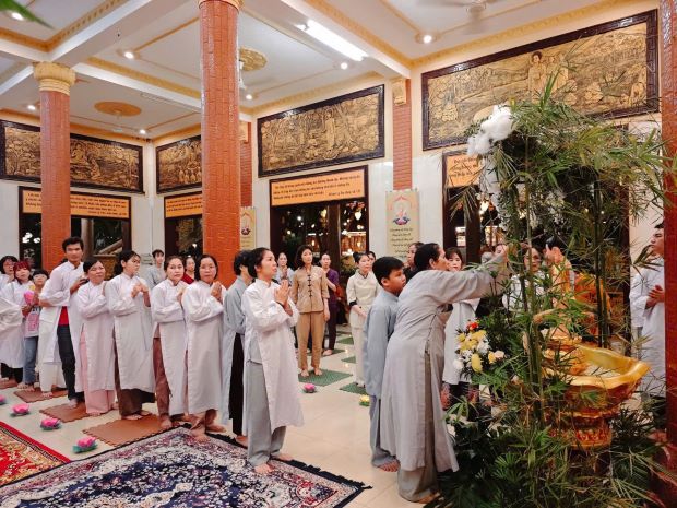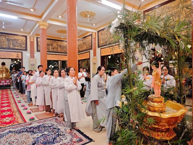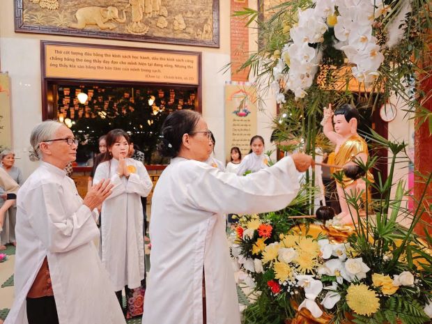 Trong không khí thiêng liêng, toàn thể hội chúng cùng phúng tụng thời kinh cầu nguyện và cử hành nghi lễ tắm Phật, thể hiện lòng thành kính hướng về Đức Bổn Sư Thích Ca Mâu Ni Phật. Những gáo nước thơm chan hòa ánh nến, tiếng chuông ngân vang như lời nhắc nhở về lý tưởng tỉnh thức và giải thoát trong đời sống hiện tại.