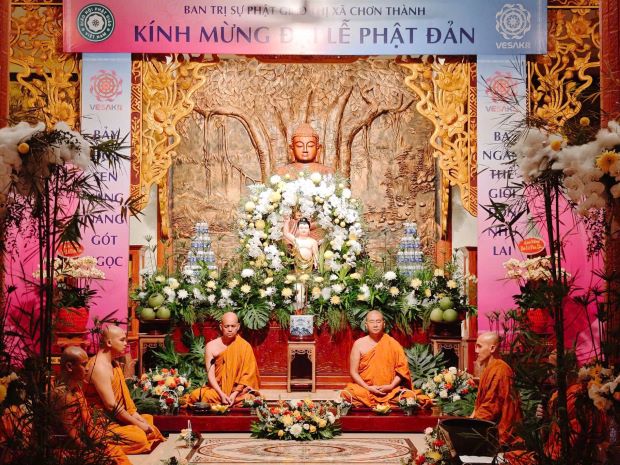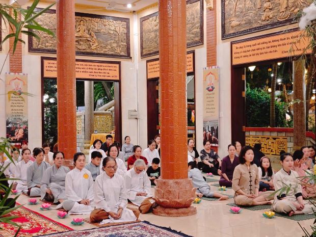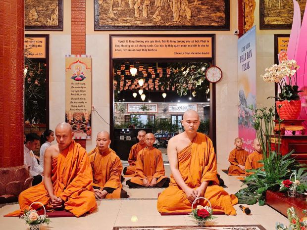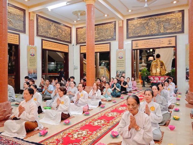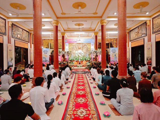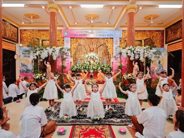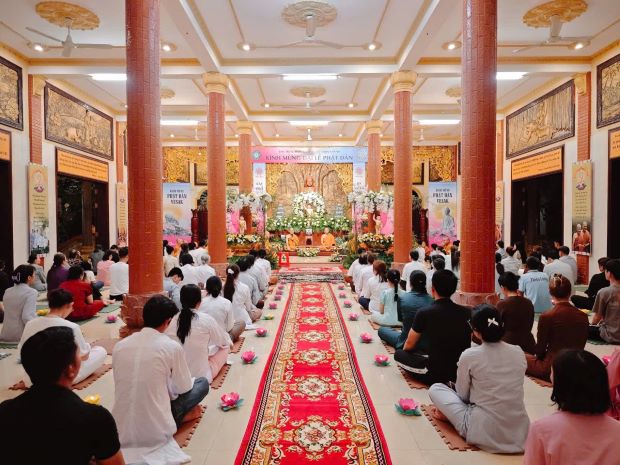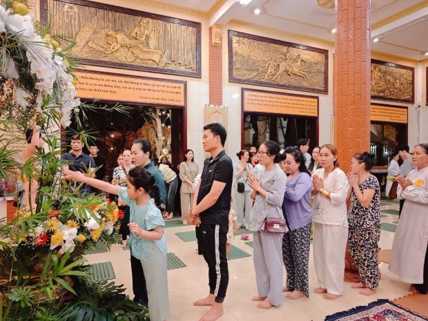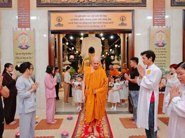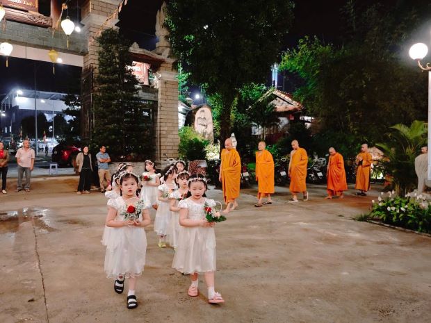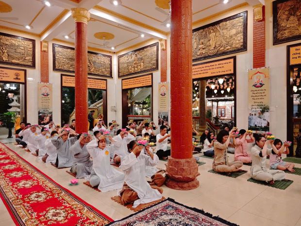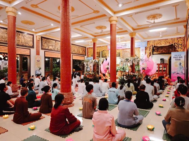 Trong không khí thiêng liêng, toàn thể hội chúng cùng phúng tụng thời kinh cầu nguyện và cử hành nghi lễ tắm Phật, thể hiện lòng thành kính hướng về Đức Bổn Sư Thích Ca Mâu Ni Phật. Những gáo nước thơm chan hòa ánh nến, tiếng chuông ngân vang như lời nhắc nhở về lý tưởng tỉnh thức và giải thoát trong đời sống hiện tại.