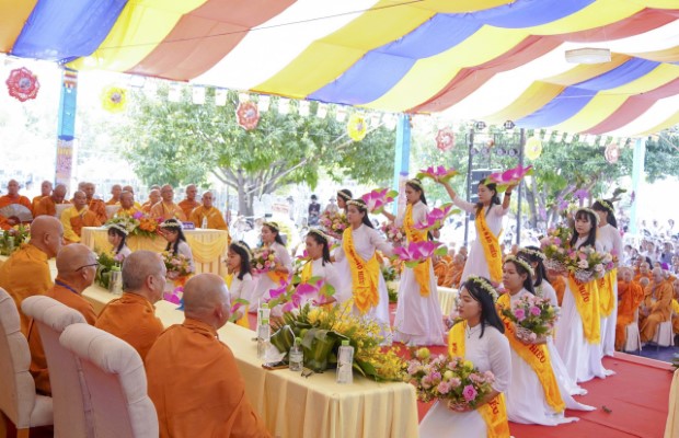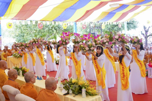 Trong tiếng nhạc lễ trầm hùng, các em thanh thiếu niên Phật tử Tịnh xá Ngọc Qui đã dâng những đóa hoa tươi thắm lên chư Tôn đức, mở đầu cho ngày hội thiêng liêng.