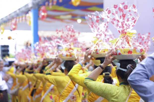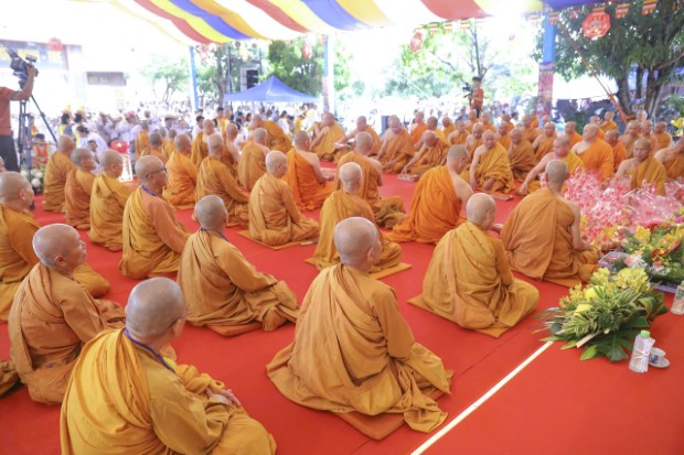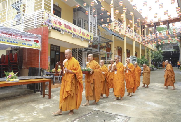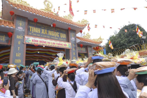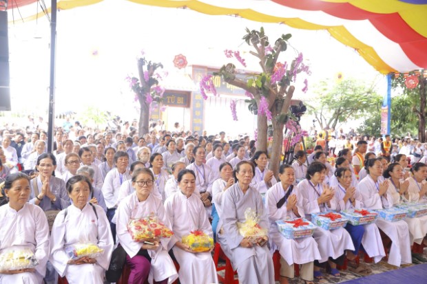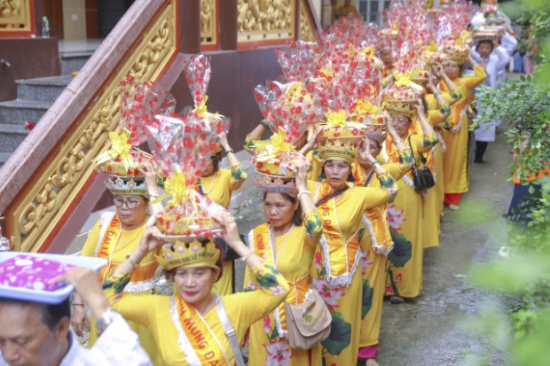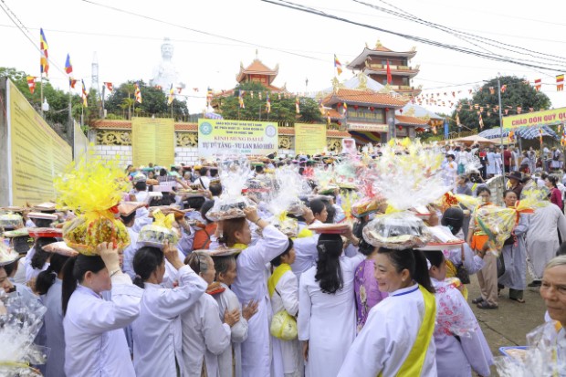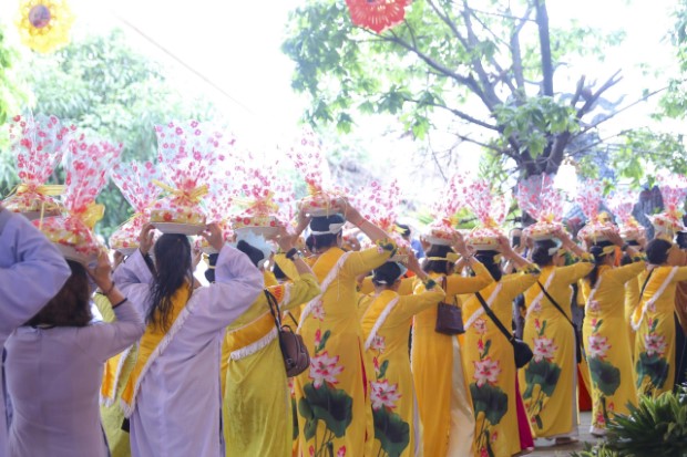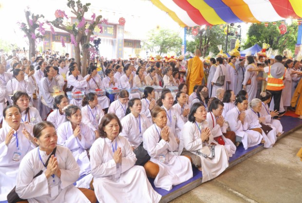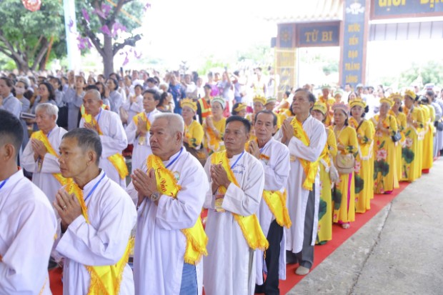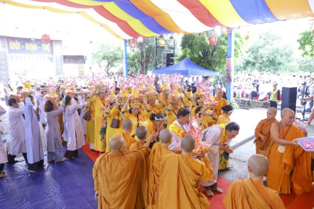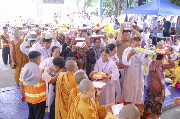 Sau lời giáo huấn của Hòa thượng chứng minh, hàng ngàn Phật tử theo sự hướng dẫn của Ban Tổ chức, xếp thành hàng ngũ trang nghiêm, nhiễu quanh tháp Phật ba vòng, đồng tụng Oai đức Ca-sa, rồi tiến về lễ đài thành kính dâng Y, Bát và tứ vật dụng cúng dường. Hình ảnh ấy vừa trang nghiêm vừa xúc động, biểu trưng cho lòng hiếu hạnh lan tỏa từ tâm người con Phật đến khắp pháp giới.