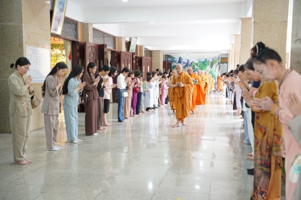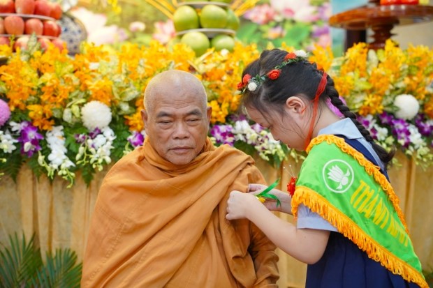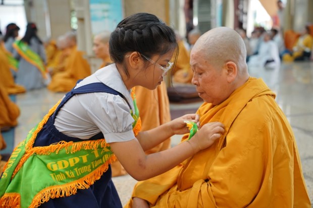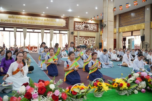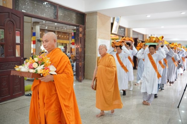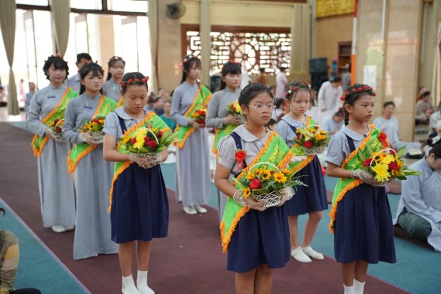 Trong sự thành kính, hội chúng đã cử hành nghi thức cài hoa hồng. Hoa vàng tượng trưng cho trí tuệ và lý tưởng giải thoát; hoa đỏ gợi nhắc niềm hạnh phúc còn được cha mẹ song toàn; hoa trắng là nỗi niềm bùi ngùi khi song thân đã khuất bóng, nhưng đồng thời cũng ẩn chứa thông điệp yêu thương và hy vọng. Mỗi bông hoa được cài lên ngực áo là một dấu ấn hiếu hạnh, nhắc nhở mọi người sống trọn đạo làm con.