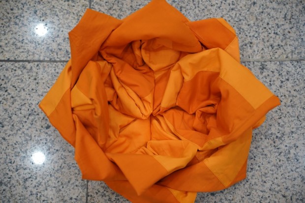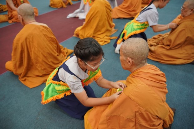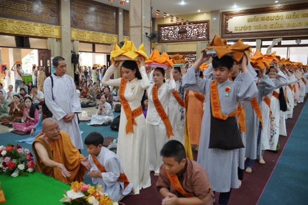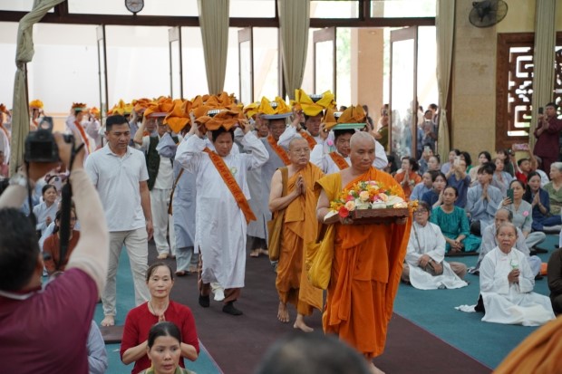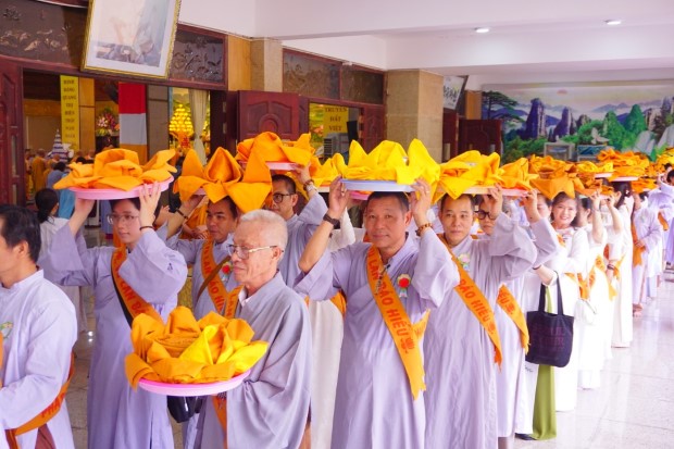 Tiếp đó, Phật tử thành kính dâng Y Ca-sa và tứ vật dụng. Hình ảnh đội y trên đầu, nâng y cúng dường, là biểu tượng đã hơn 26 thế kỷ lưu truyền trong Phật giáo, thể hiện tấm lòng tôn kính đối với Tăng đoàn, đồng thời gieo phước điền và hồi hướng công đức đến cửu huyền thất tổ cùng cha mẹ nhiều đời.