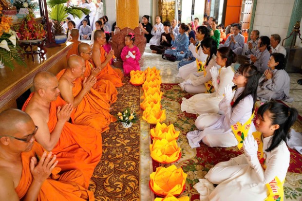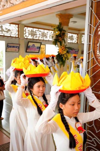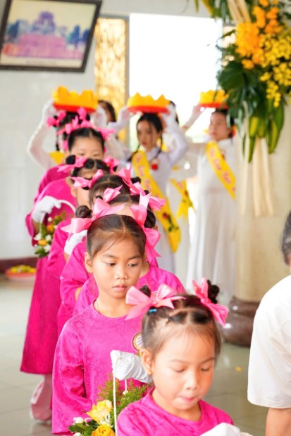 Song song đó, nghi thức bông hồng cài áo cũng được tổ chức đầy xúc động. Những đóa hồng trắng, hồng đỏ cài lên ngực áo đã làm sống lại bao kỷ niệm ân tình, nhắc nhở mỗi người con Phật trân quý giây phút còn cha mẹ và luôn giữ trọn hiếu đạo trong từng hành động.