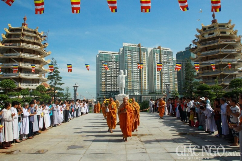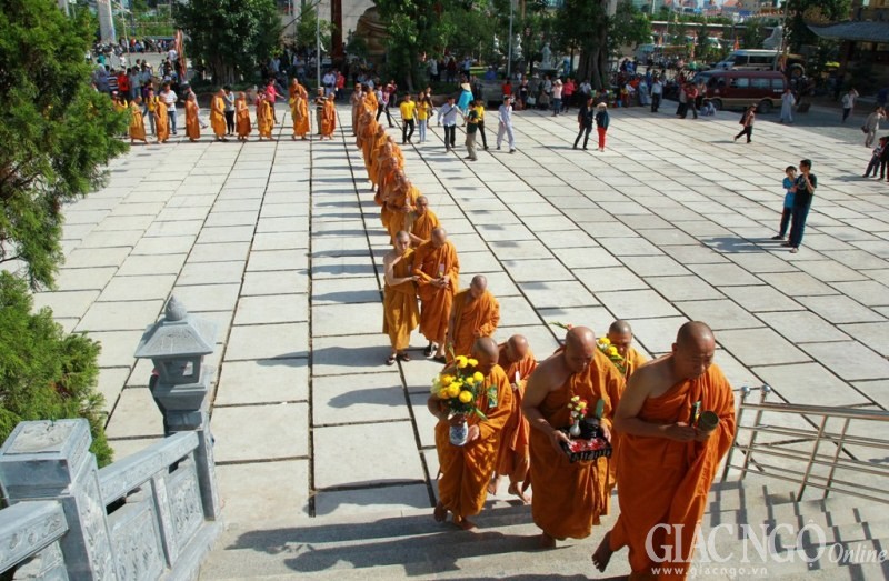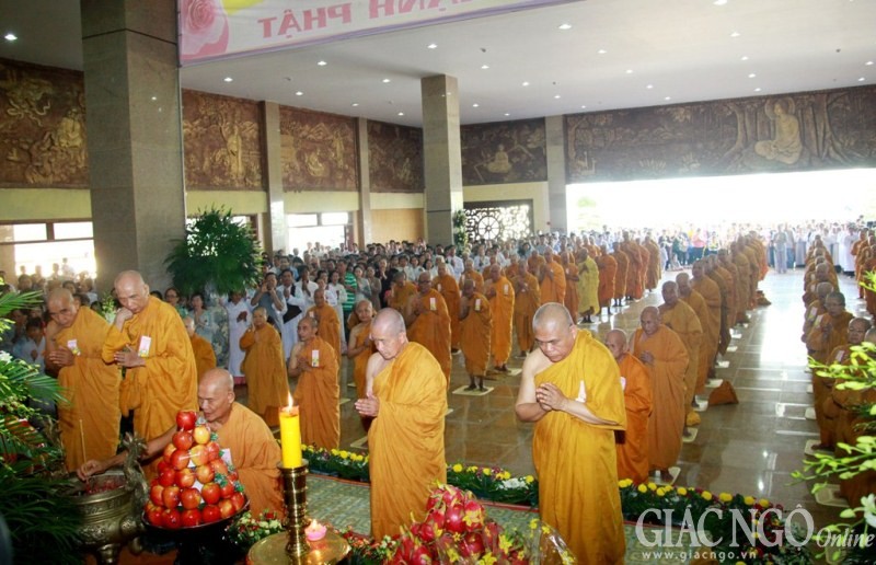 Chư Tôn đức từ từ tiến vào chánh điện trong sự trang nghiêm cung đón của Phật tử các giới