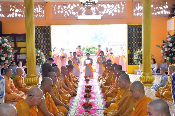 Trong niềm xúc cảm sâu lắng, nhóm Phật tử Quý Liên đã dâng hoa cúng dường Tam bảo. Phật tử Liễu Ngọc thay mặt đại chúng đọc bài cảm niệm, nhắc nhớ ân nghĩa sinh thành và phát nguyện dâng Pháp Y Ca-sa cúng dường chư Tôn đức, hồi hướng công đức đến cha mẹ hiện tiền và cửu huyền thất Tổ.
