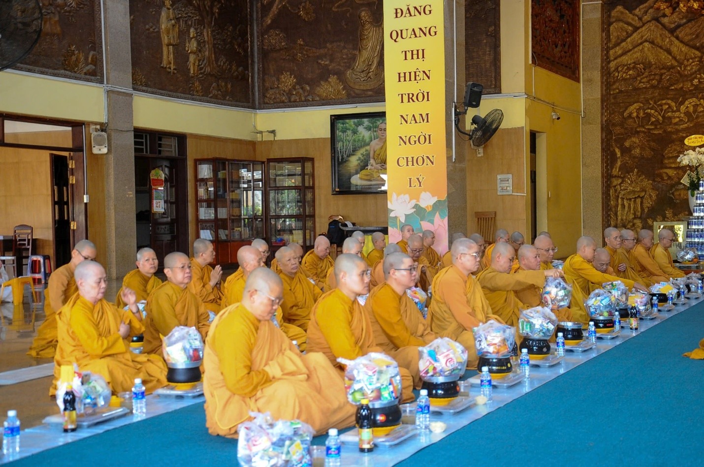 Vào lúc 14h00, chư Tăng Ni cùng Phật tử vân tập tại Giảng đường để tụng Chơn lý. Những bài pháp của Đức Tổ sư vang lên, giúp đại chúng ôn lại giáo pháp, quán chiếu tự thân và vững bước trên con đường tu tập.