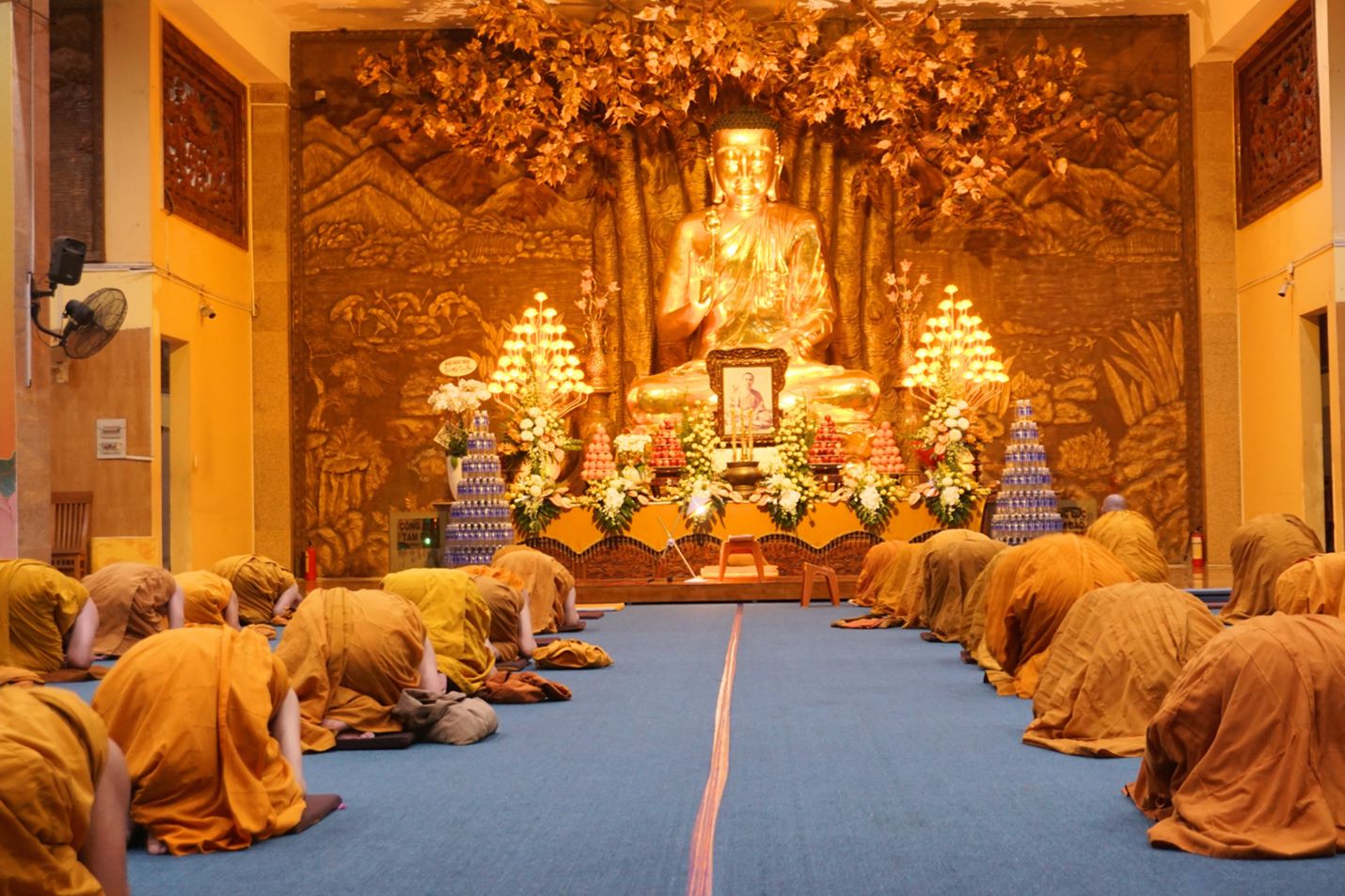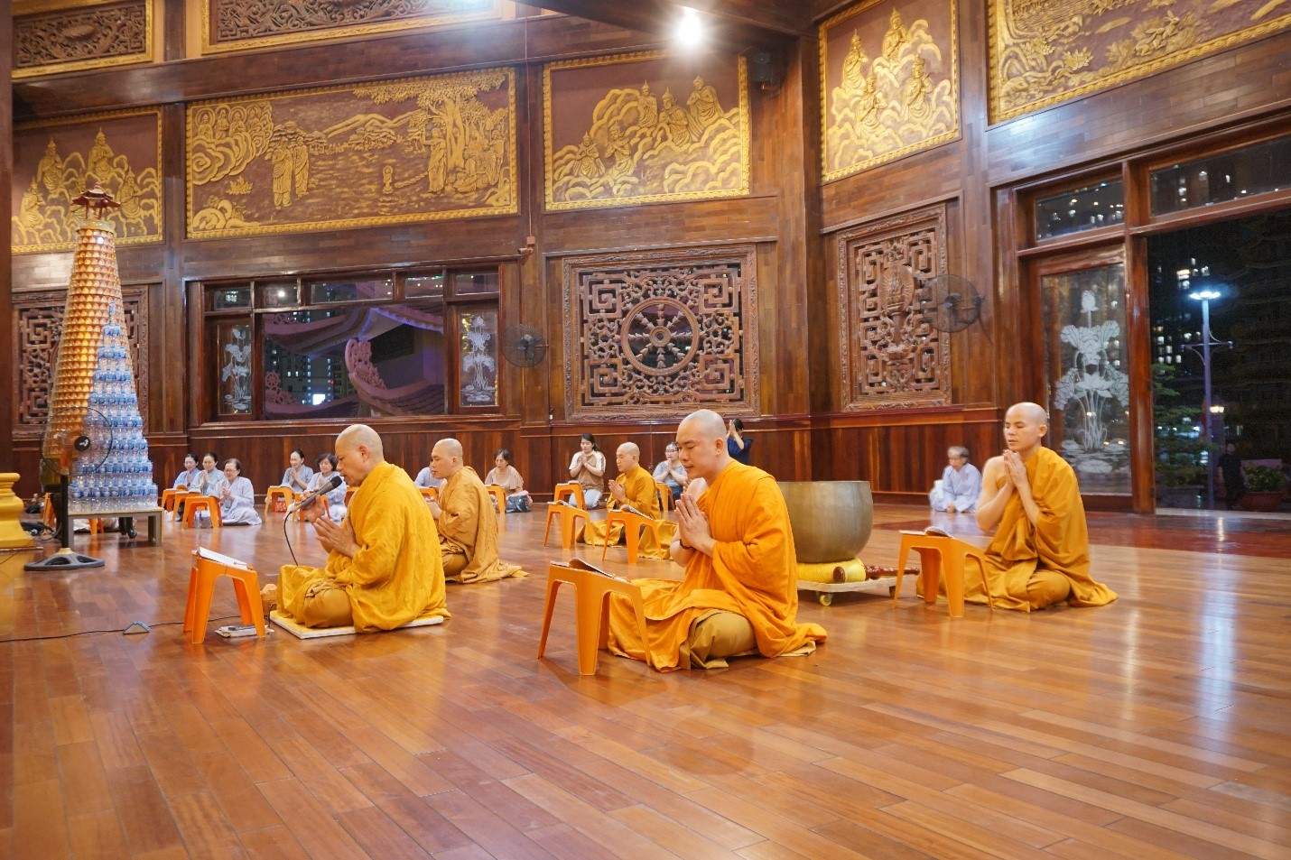 Vào lúc 18h30, toàn thể hội chúng đồng vân tập về Chánh điện để cử hành lễ Sám hối. Đây là thời khắc quan trọng để mỗi hành giả tự quán chiếu bản thân, đối diện với những sai lầm trong quá trình tu tập và thành tâm sám hối trước Tam bảo.