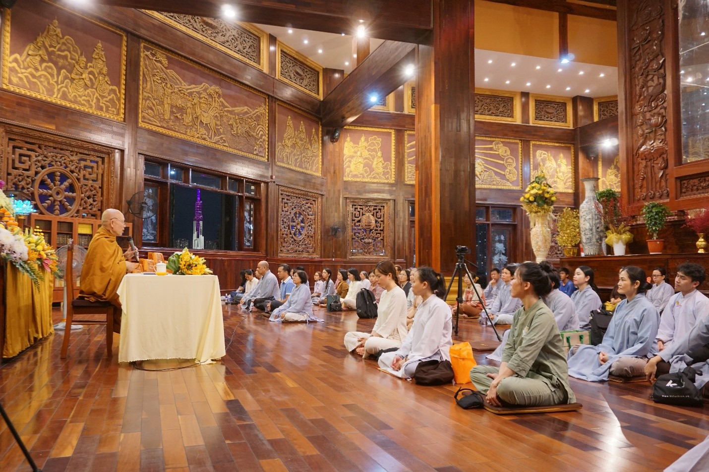 Sau thời tụng sám hối, lúc 19h15, đại chúng cùng cung đón HT. Minh Thành - UVTT HĐTS GHPGVN, Phó Viện trưởng VNCPHVN, Phó ban Ban Thường trực Giáo phẩm Hệ phái, Trưởng Ban Giáo dục Tu thư PGKS, ngồi lại lắng nghe buổi thuyết pháp về Chơn lý của Đức Tổ sư.