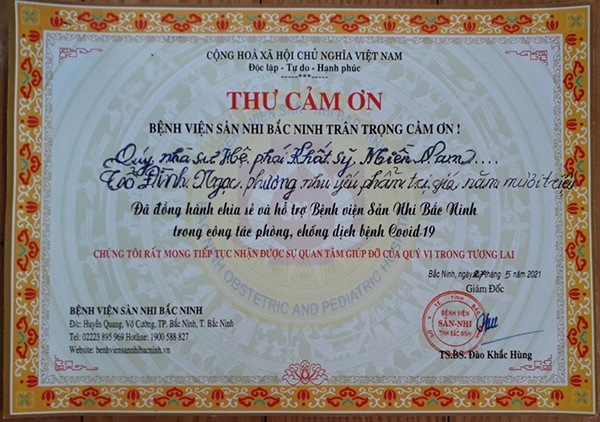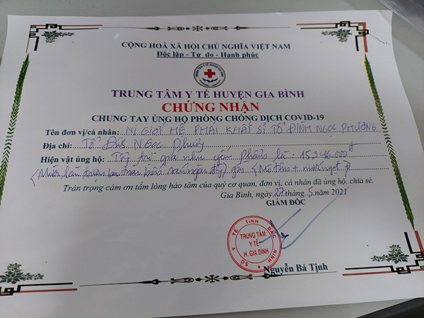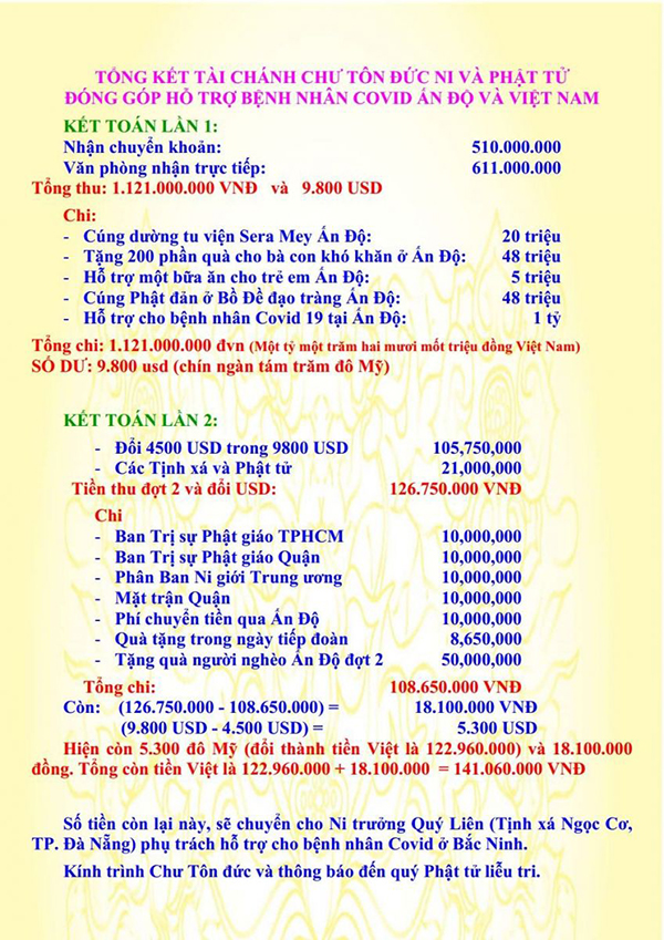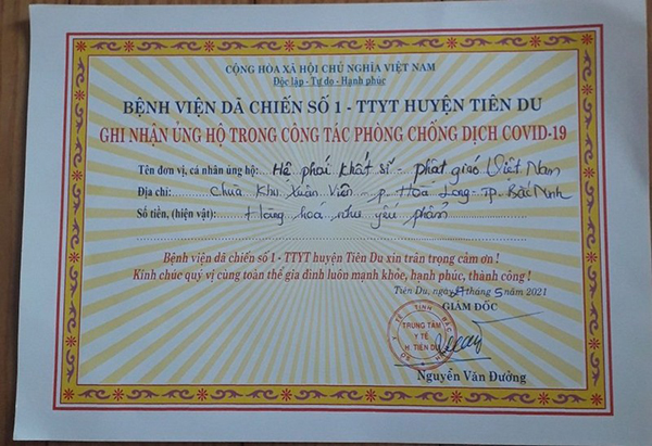 Số tiền còn lại, sẽ chuyển cho Ni trưởng Quý Liên (Tịnh xá Ngọc Cơ, TP. Đà Nẵng) phụ trách hỗ trợ cho bệnh nhân Covid ở Bắc Ninh và do Sư cô Vũ Liên - Trụ trì chùa Xuân Viên, TP. Bắc Ninh đảm nhiệm công việc chia sẻ yêu thương đến đội ngũ y bác sĩ và bệnh nhân tại vùng có tâm dịch nặng.