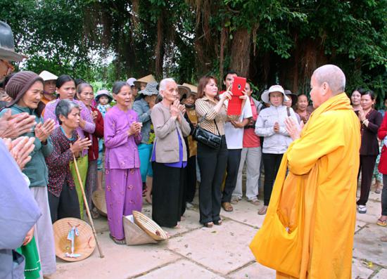 Đến với đồng bào địa phương, Ni trưởng Hiệp Liên đã có lời thăm hỏi chia sẻ, khuyến khích bà con cố gắng vượt qua những khó khăn nhằm ổn định cuộc sống sau thiên tai lũ lụt và sớm trở lại không khí bình an.