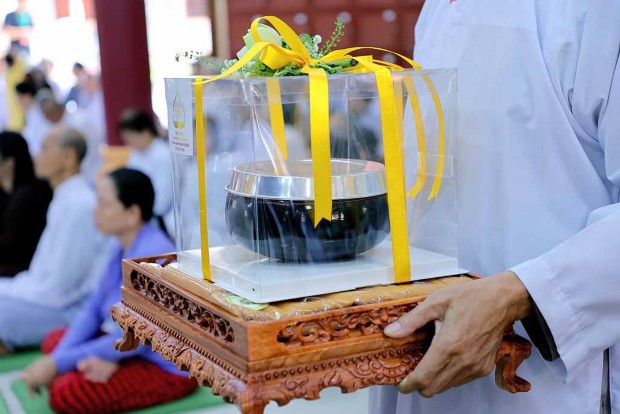 Sau khi lắng nghe ý nghĩa Vu lan và lễ Tự tứ, Phật tử Thiện Ngộ đại diện cho hàng Phật tử, đã thành kính tác bạch và dâng Y Bát cúng dường lên chư Tôn đức Tăng Ni. Từng tấm huỳnh Y, từng phẩm vật, không chỉ là vật phẩm cúng dường, mà còn là biểu trưng cho niềm tôn kính Tam bảo, cho tâm hiếu thảo chí thành của hàng Phật tử, đồng tâm niệm hồi hướng, cầu nguyện cho cửu huyền thất Tổ siêu sanh tịnh cảnh, cha mẹ hiện tiền phước thọ miên trường.