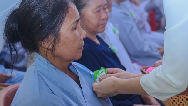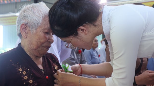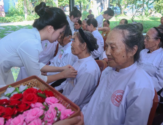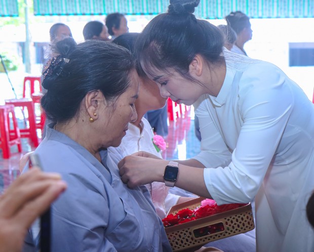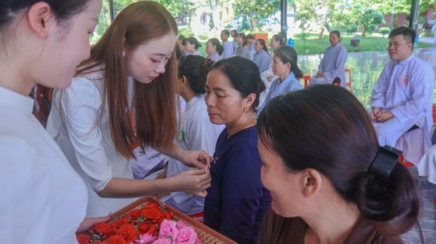 Mở đầu buổi lễ,đại diện hàng Phật tử, Phật tử Ngọc Tâm dâng lời cảm niệm Tứ ân, qua đó nhắc nhớ ân Tam Bảo, ân cha mẹ, ân quốc gia xã hội và ân chúng sanh. Cùng với đó, ca khúc “Bông hồng cài áo” được ngân vang, đã gợi lên bao cung bậc cảm xúc, để rồi nghi thức cài hoa được các bạn trẻ CLB Thanh thiếu niên Phật tử Tịnh xá Linh Sơn thực hiện trong niềm trang trọng và lắng đọng. Đóa hồng trên ngực áo mỗi người không chỉ là biểu tượng của tình mẫu tử, phụ tử mà còn là lời nhắc nhớ về trách nhiệm báo hiếu, báo ân.