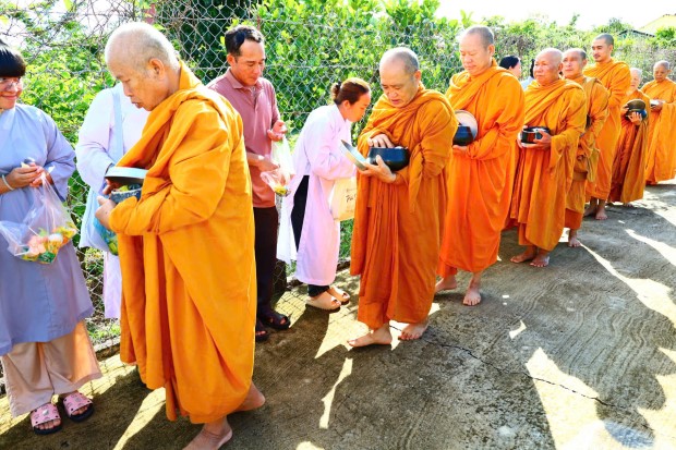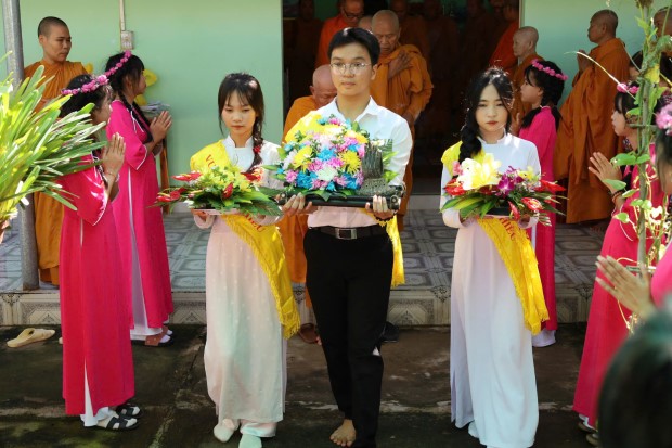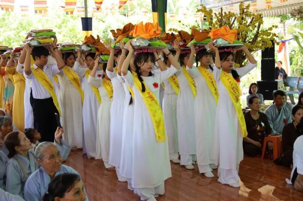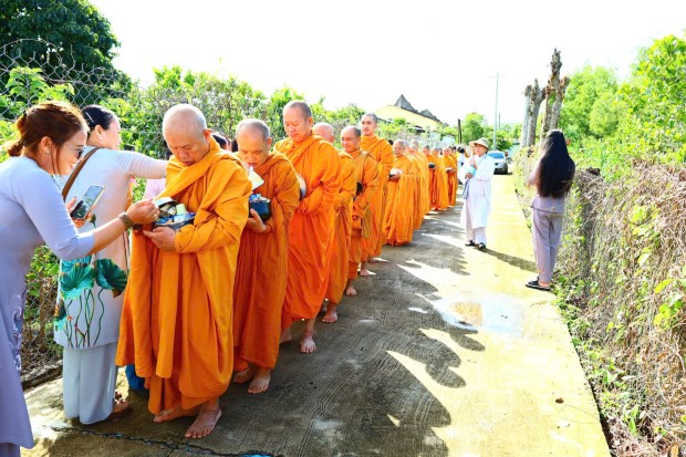 Sau phần lễ, chư Tôn đức cử hành nghi thức cúng dường trai Tăng và dâng Y Ca-sa. Những tấm Y vàng được nâng lên bằng cả tấm lòng thành kính, không chỉ là y phục che thân, mà còn là Y phước điền, Y giải thoát, biểu tượng của giới hạnh và lý tưởng xuất gia. Nhờ đó, hàng Phật tử gieo trồng phước đức, kết nối sâu xa với Tam bảo.