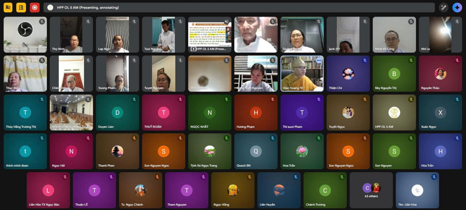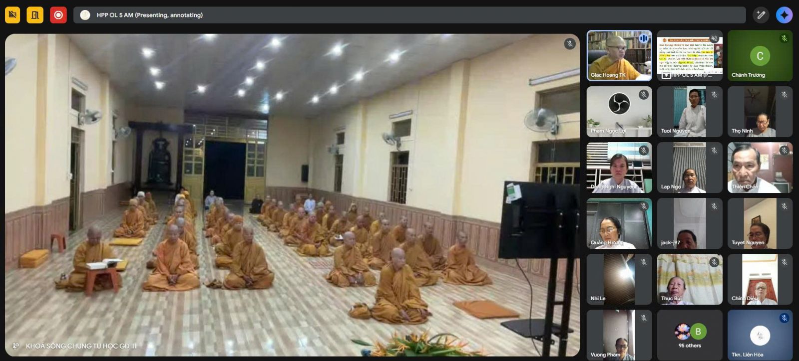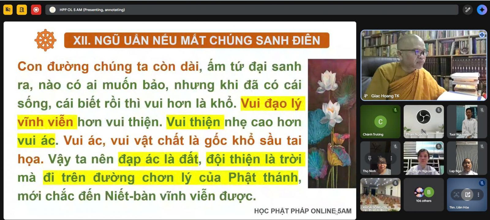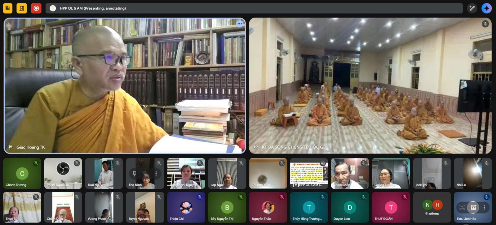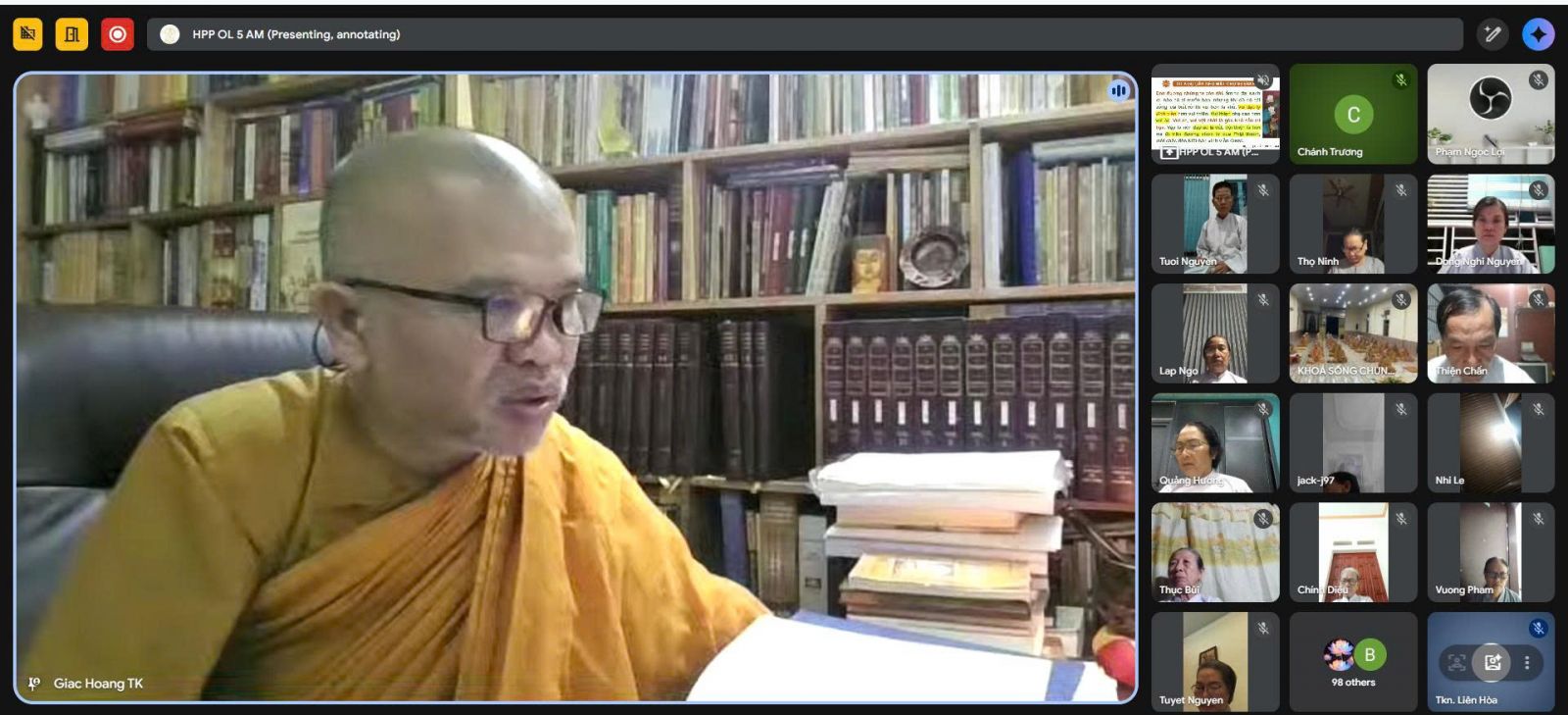 Sau thời thiền tập, đại chúng đồng lắng nghe pháp thoại trực tuyến qua ứng dụng Google Meet, do TT. Giác Hoàng – Ủy viên HĐTS, Phó Viện trưởng VNCPHVN, Phó Trưởng ban Văn hóa TƯGH, Chánh Thư ký Ban Thường trực Giáo phẩm Hệ phái, Phó trưởng Ban Thường trực Ban Giáo dục Tăng Ni GĐ.III PGKS, thuyết giảng với chủ đề Chơn lý “Ngũ uẩn”.