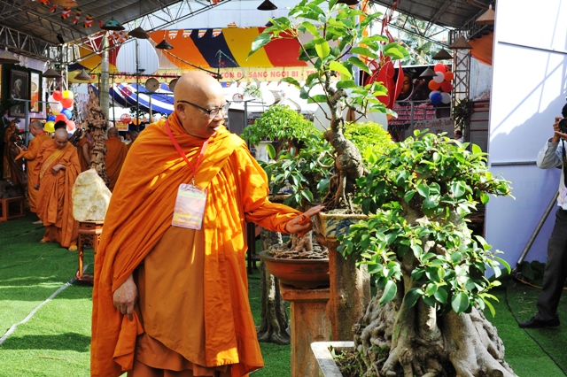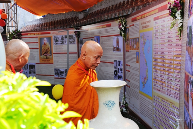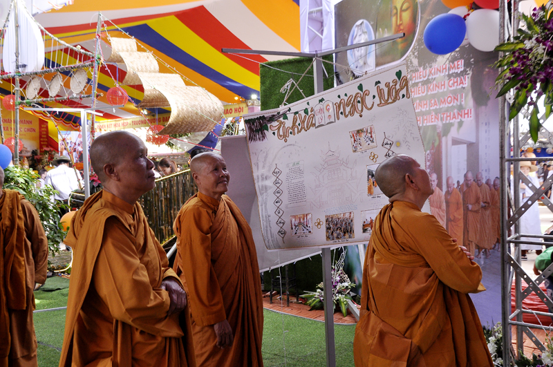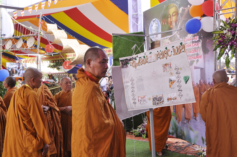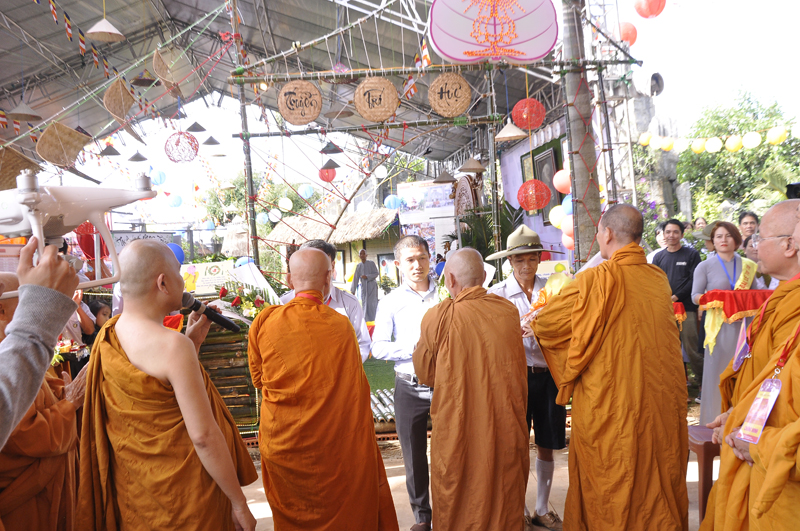 Sau lễ cắt băng, chư Tôn đức và quý Phật tử tham quan phòng triển lãm dưới sự thuyết minh của Phật tử Ngọc Chơn (về ngọn đuốc Khất sĩ) và Phật tử Lê Đức Lâu (về văn hóa cồng chiêng Tây Nguyên).