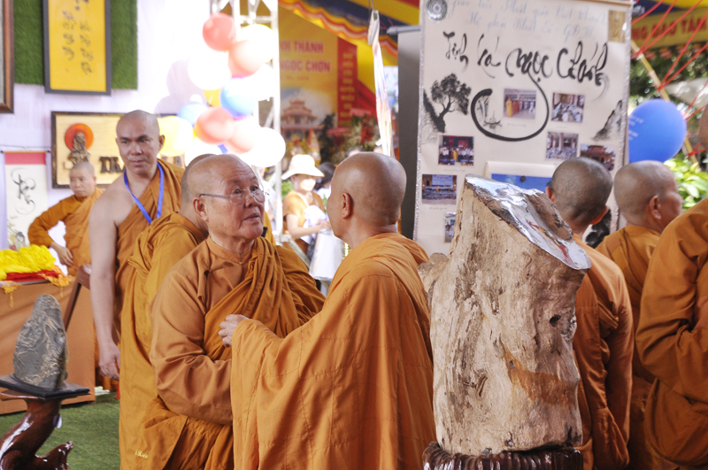 Tiếp sau đó, Ban Tổ chức cung thỉnh tam vị Hòa thượng: HT. Giác Hùng; HT Giác Phùng; HT Giác Trí trao tặng hoa cho các cá nhân có nhiều đóng góp trong việc mở phòng triển lãm. Đó là: Phật tử Thạch Triệu Mẫn đã đóng góp các tác phẩm đá quý; Phật tử Trần Thanh Kiệm đã góp tác phẩm Gỗ Lửa; Huynh trưởng Nhuần Hoằng – Vũ Đình Huy (Liên đoàn trưởng Gia đình Phật tử Ngọc Chơn)